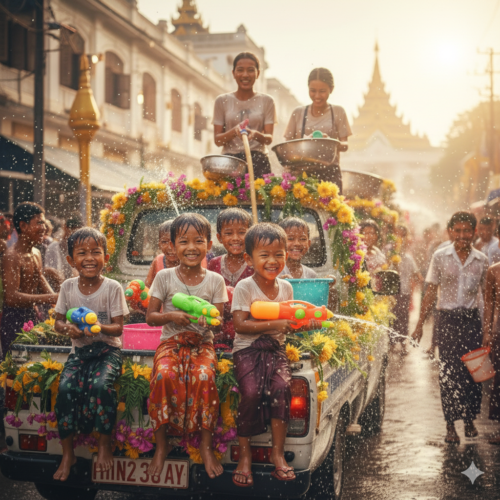 実は、ミャンマーの暦において「新年」が訪れるのは4月。仏教徒が多いミャンマーでは、4月中旬に迎える伝統的な正月「ティンジャン(水かけ祭り)」こそが、一年で最も重要な長期休暇であり、文字通りの「年越し」の時期なのです。この時期は全国が祝日となり、人々は家族や親戚と集い、盛大に水をかけ合って厄を払い、新しい年の幸福を願います。街中が水浸しになるこの光景は、ミャンマーの活力そのもの。寺院では功徳を積むための仏事が行われ、人々は動物の殺生を控えるなど、宗教的な意味合いも深い時期です。